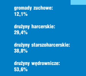 Ciekawie wygląda też procentowy udział drużynowych – mężczyzn w drużynach poszczególnych poziomów metodycznych (wg danych z Badania Drużynowego 2023). Widać, że wśród drużynowych zuchowych 1 mężczyzna przypada na każde 7 kobiet. Wśród drużynowych harcerskich proporcja ta wynosi 1:2,4. Udział mężczyzn rośnie z wiekiem wychowanków i dla drużyn wędrowniczych zrównuje się z udziałem kobiet, drużyn tych jest jednak niewiele i w efekcie sumarycznie zdecydowaną większość wychowania w gromadach i drużynach prowadzą drużynowe.